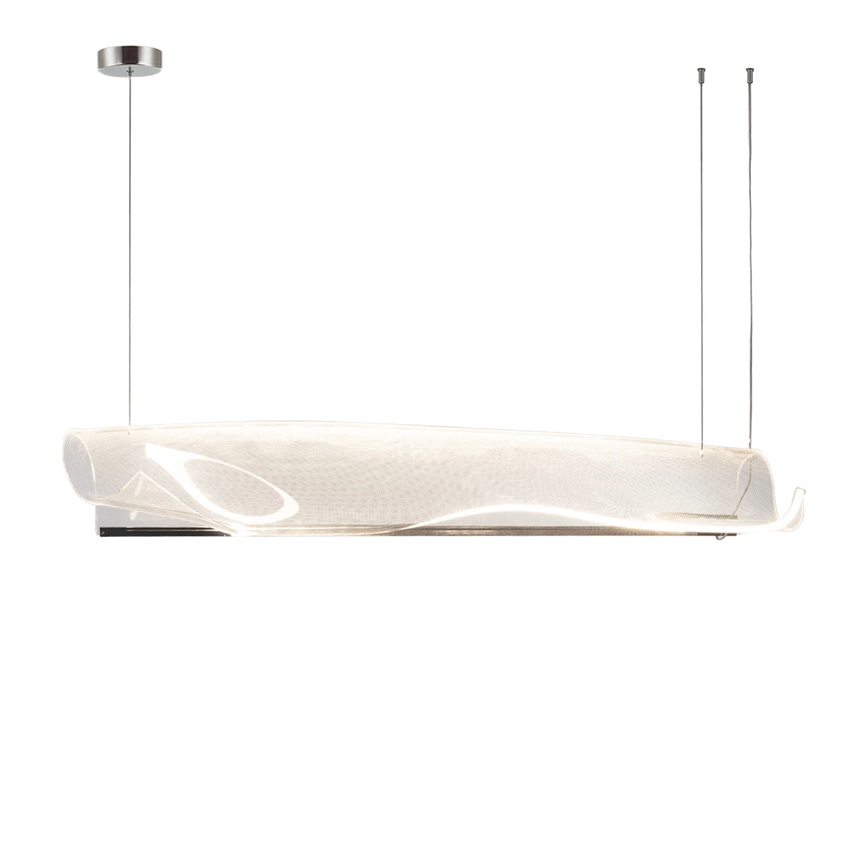 The source of the LED light has been placed on one side. The material and the structure of the lampshade perfectly distribute the light in all directions. The result is amazing! The lamp is much easier to clean than its glass cousins. It is also safer and more durable. The collection includes pendant lamps of various sizes, with lampshades suspended horizontally and vertically.