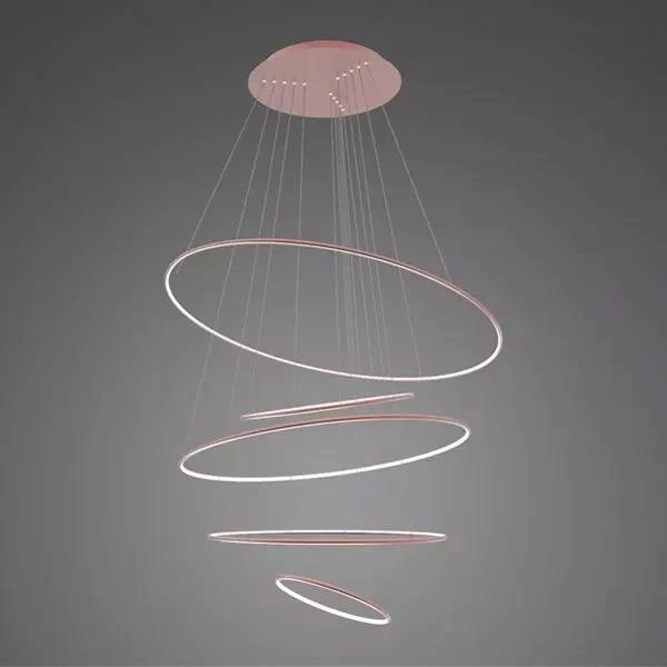 The LED Pendant Lamp Circles No.5 in rose gold is an excellent choice for those who appreciate a blend of elegance and modernity. Its unique appearance, based on five interconnected rings, draws attention and becomes a striking decoration in any room. The aluminum construction and finish in a fashionable, subtle shade of rose gold emphasize the luxurious character of the product. It is perfect for spacious living rooms, designer dining areas, as well as modern offices where impressive yet functional lighting decoration matters.